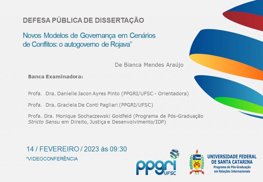 A apresentação do trabalho da mestranda Bianca Mendes Araújo, intitulado “Novos Modelos de Governança em Cenários de Conflitos: o autogoverno de Rojava” será realizada virtualmente no dia 14 de fevereiro (terça-feira) às 09:30 e poderá ser acompanhada mediante o seguinte endereço: meet.google.com/wnh-hffz-tsi