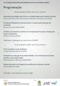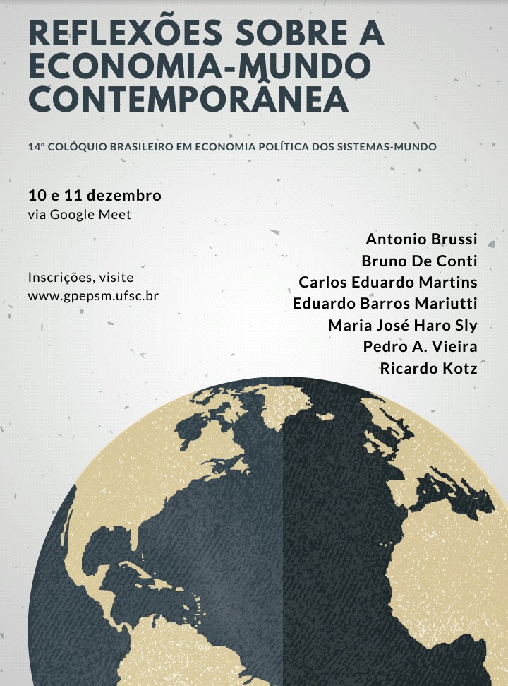Nos dias 10 e 11 de dezembro o GPEPSM (Grupo de Pesquisa em Economia Política dos Sistemas Mundo) promoverá o 14° Colóquio brasileiro em Economia Política dos sistemas-mundo. O evento ocorrerá via Google Meet e as inscrições deverão ser realizadas pelo site www.gpepsm.ufsc.br.