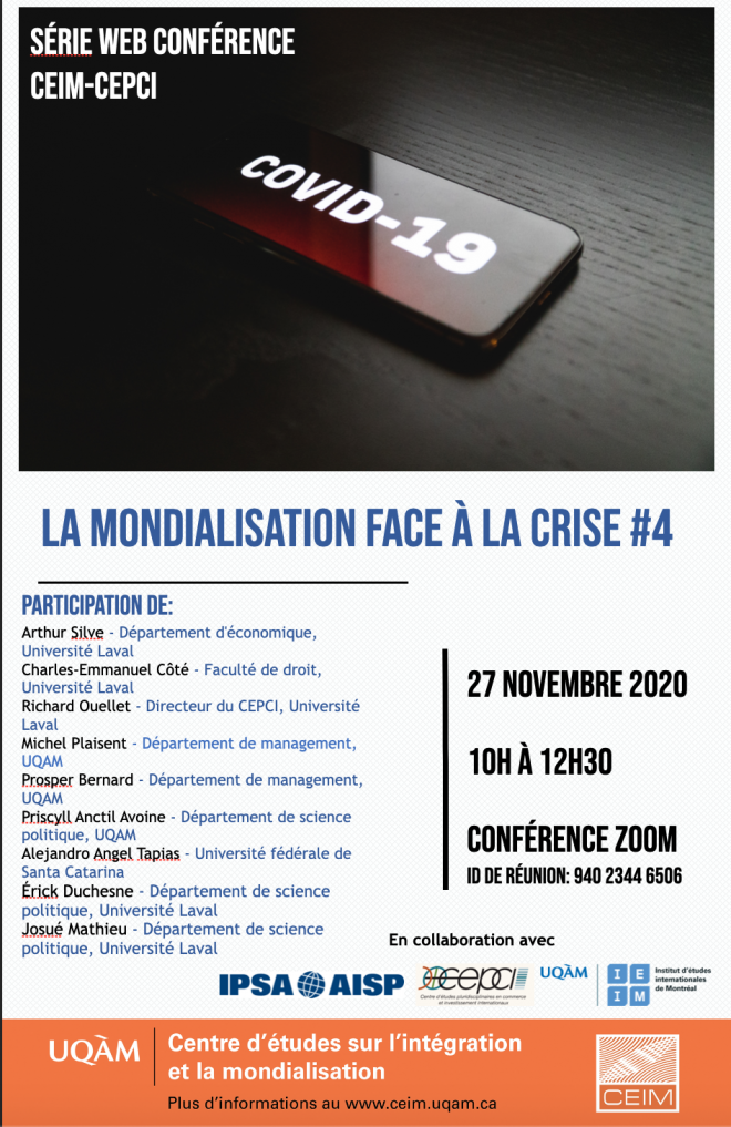 O seminário ocorrerá no dia 27 de novembro (sexta-feira), às doze horas no horário de Brasília, e contará com a participação do pós-doutorando do Programa de Pós-Graduação em Relações Internacionais da UFSC Alejandro Angel Tapias. O site do evento está no seguinte endereço https://ieim.uqam.ca/spip.php?page=article-ceim&id_article=12819&lang=fr.